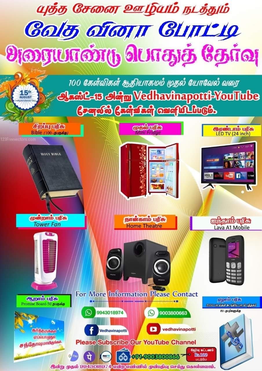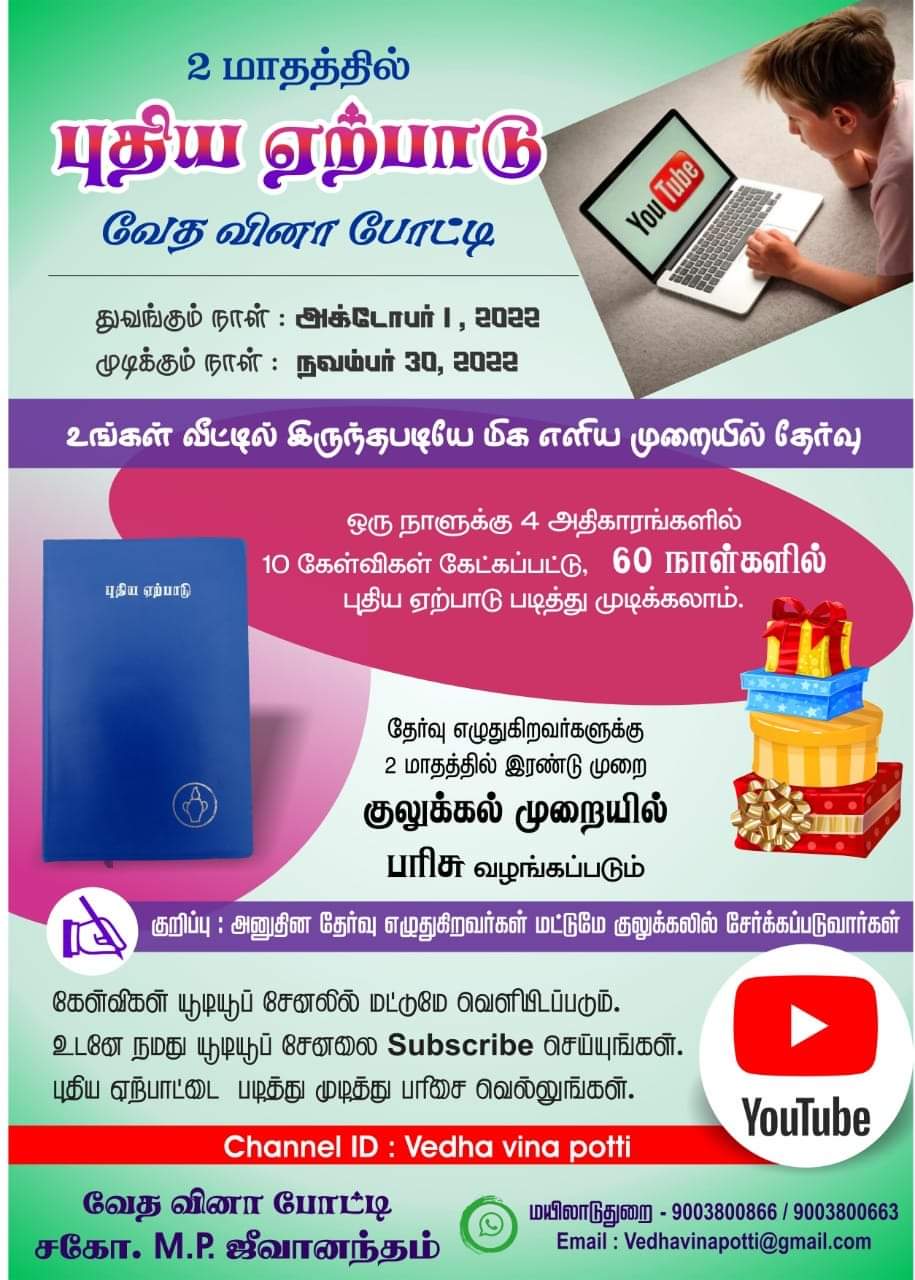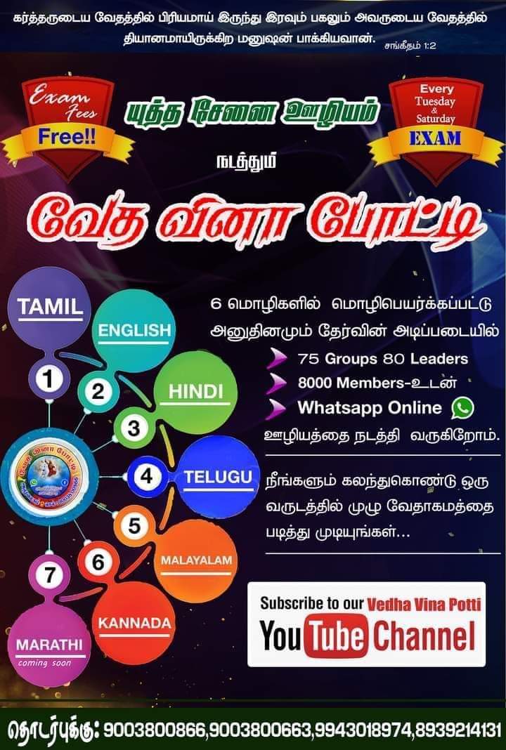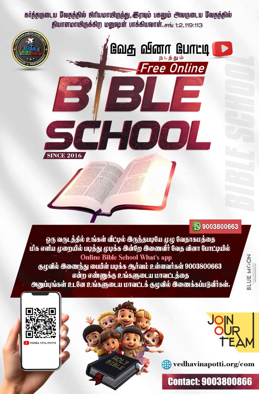 வேத வினா போட்டியில் இணைந்து எளிய முறையில் முழு வேதாகமத்தையும் ஓர் ஆண்டில் படித்து முடிக்க இன்றே இணைவீர்! தேவ ஆசீர்வாதத்தை பெற்றுக்கொள்வீர்!!