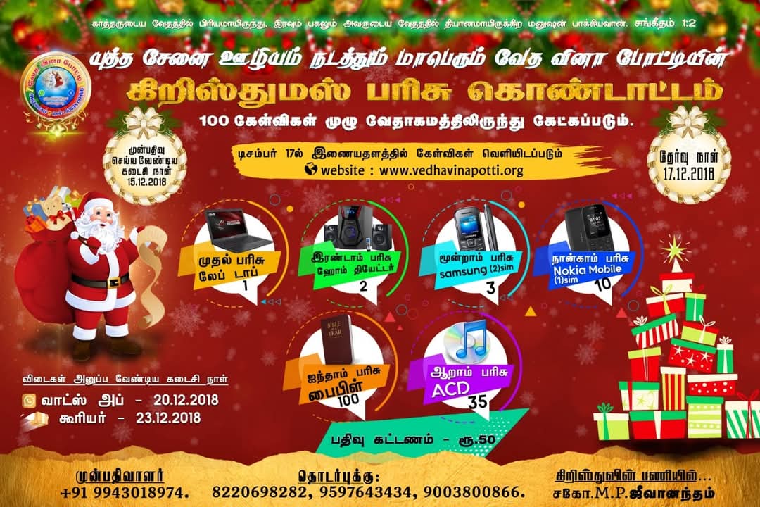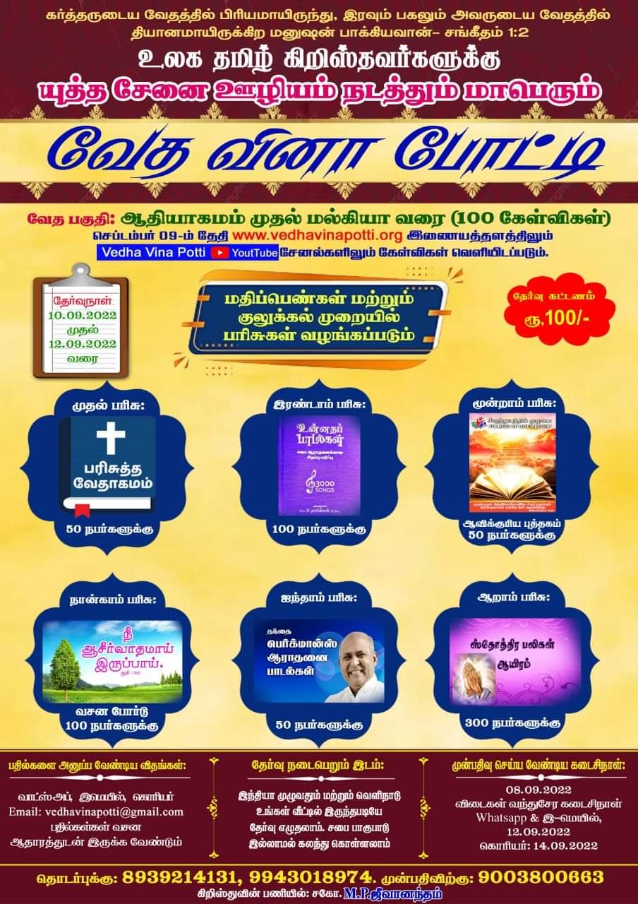 வேத வினா போட்டியில் இணைந்து எளிய முறையில் முழு வேதாகமத்தையும் ஓர் ஆண்டில் படித்து முடிக்க இன்றே இணைவீர்! தேவ ஆசீர்வாதத்தை பெற்றுக்கொள்வீர்!!