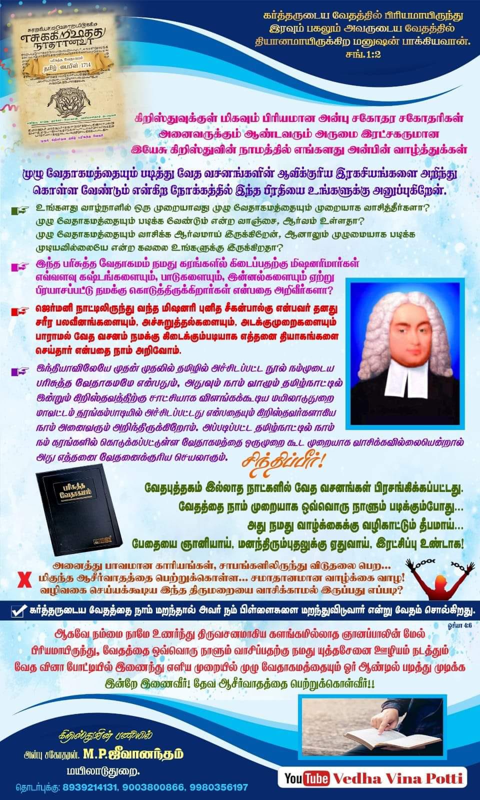ஜெர்மனி நாட்டிலிருந்து வந்த மிஷனரி புனித சீகன்பால்கு என்பவர் தனது சரீர பலவீனங்களையும். அச்சுறுத்தல்களையும், அடக்குமுறைகளையும் பாராமல் வேத வசனம் நமக்கு கிடைக்கும்படியாக எத்தனை தியாகங்களை செய்தார் என்பதை நாம் அறிவோம்.